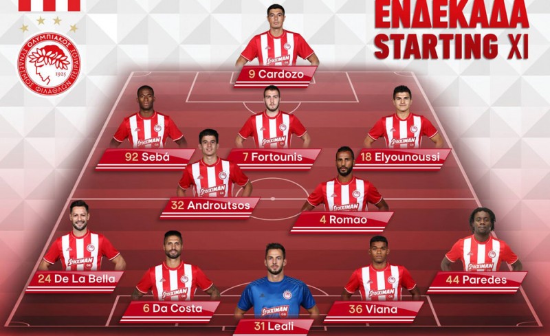 Η ενδεκάδα του Ολυμπιακού: Λεάλι, Παρέδες, Βιάνα, Ντα Κόστα, Ντε Λα Μπέγια, Ρομαό, Ανδρούτσος, Ελιουνούσι, Φορτούνης, Σεμπά, Καρντόσο.