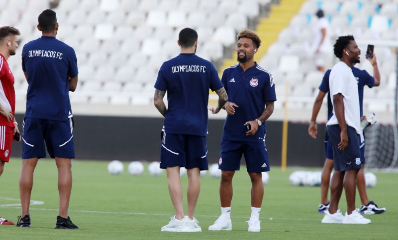 Οι «ερυθρόλευκοι» λίγη ώρα μετά την άφιξή τους στο «ΓΣΠ», βγήκαν στον αγωνιστικό χώρο και έκαναν την καθιερωμένη βόλτα στον αγωνιστικό χώρο του γηπέδου.