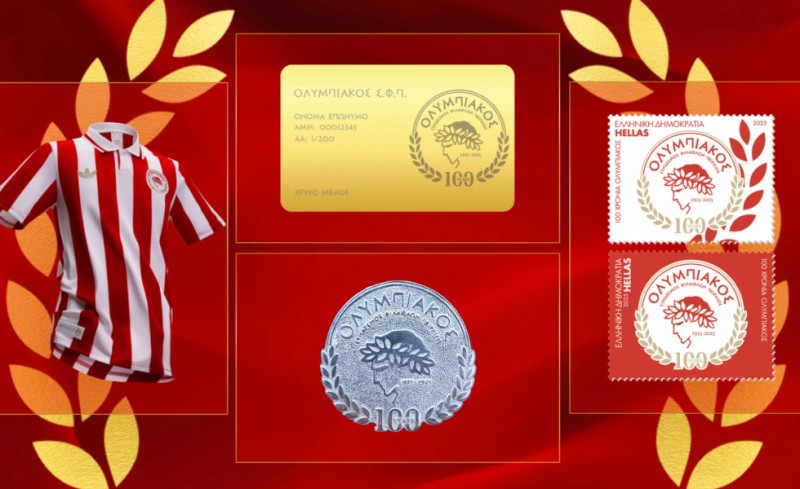 ☑️ Την αναμνηστική Σειρά Γραμματοσήμων «100 Χρόνια Ολυμπιακός» με απεικόνιση τον Δαφνοστεφανωμένο Έφηβο, που περιλαμβάνει επίσης Φάκελο Πρώτης Ημέρας Κυκλοφορίας.
