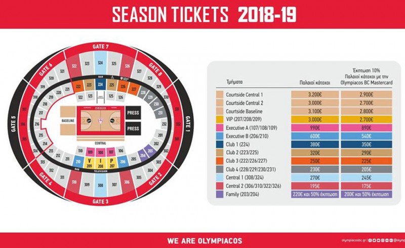 Η διάθεση των καρτών διαρκείας θα πραγματοποιείται από τα εκδοτήρια και τα γραφεία της Κ.Α.Ε. ΟΛΥΜΠΙΑΚΟΣ στο Στάδιο Ειρήνης και Φιλίας (Εθνάρχου Μακαρίου 1, Νέο Φάληρο), μέσω της επίσημης ιστοσελίδας της ομάδας στο www.olympiacosbc.gr, αλλά Η διάθεση των καρτών διαρκείας θα πραγματοποιείται από τα εκδοτήρια και τα γραφεία της Κ.Α.Ε. ΟΛΥΜΠΙΑΚΟΣ στο Στάδιο Ειρήνης και και μέσω του τηλεφωνικού κέντρου στο 210 89 38 007.