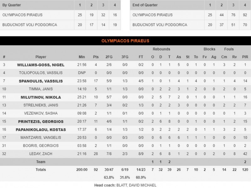 Οι «ερυθρόλευκοι» έχασαν το δεκάλεπτο με επιμέρους σκορ 19-16 υπέρ της Μπουντούτσνοστ, με τον Ντέιβιντ Μπλατ να αφήνει στο παρκέ τον ΛεΝτέι αφού ήταν η βραδιά του και τον κράτησε τόσο όσο χρειαζόταν για να φτάσει στο ρεκόρ!