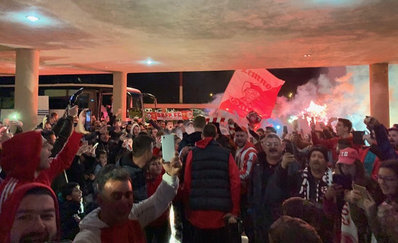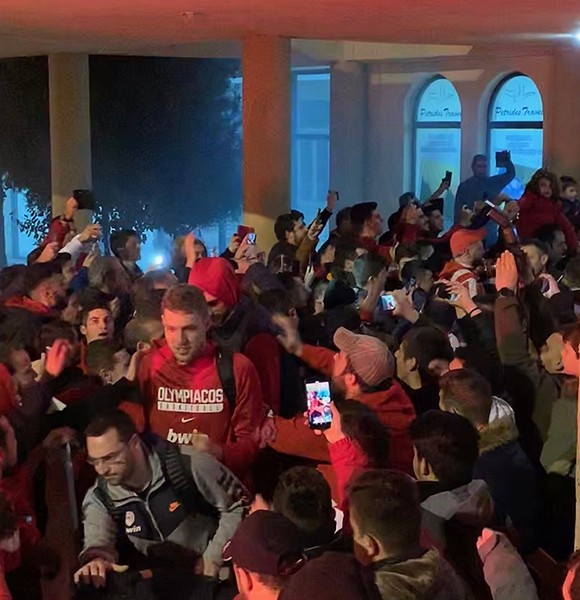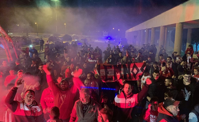 Ο κόσμος του Ολυμπιακού έκανε τη νύχτα μέρα στο νησί με τα καπνογόνα, ενώ δεν σταμάτησαν να φωνάζουν συνθήματα για την ομάδα του Πειραιά.