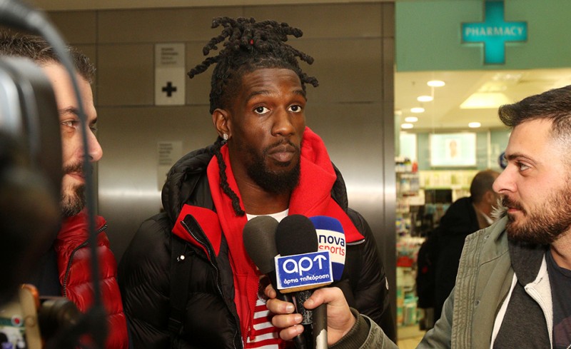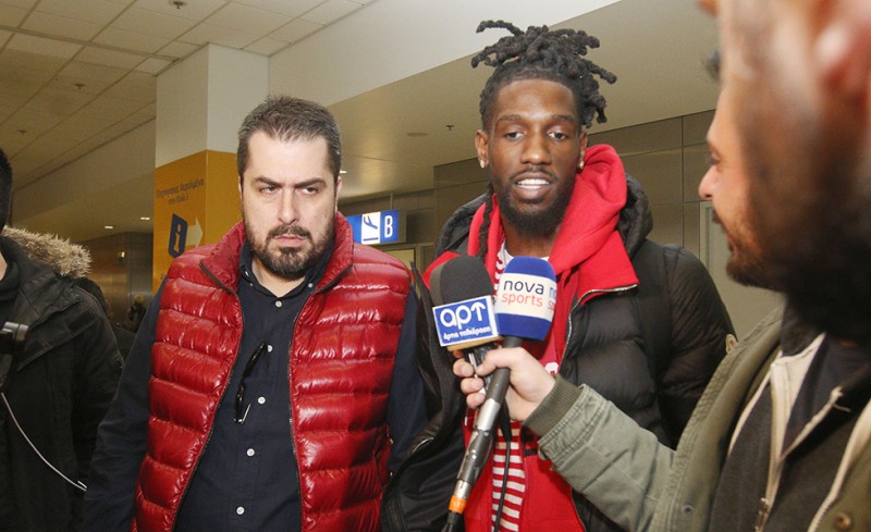 Ο Αμερικανός γκαρντ εμφανίστηκε ανυπόμονος στις δηλώσεις του και πρόλαβε να βάλει και το φούτερ του Ολυμπιακού.