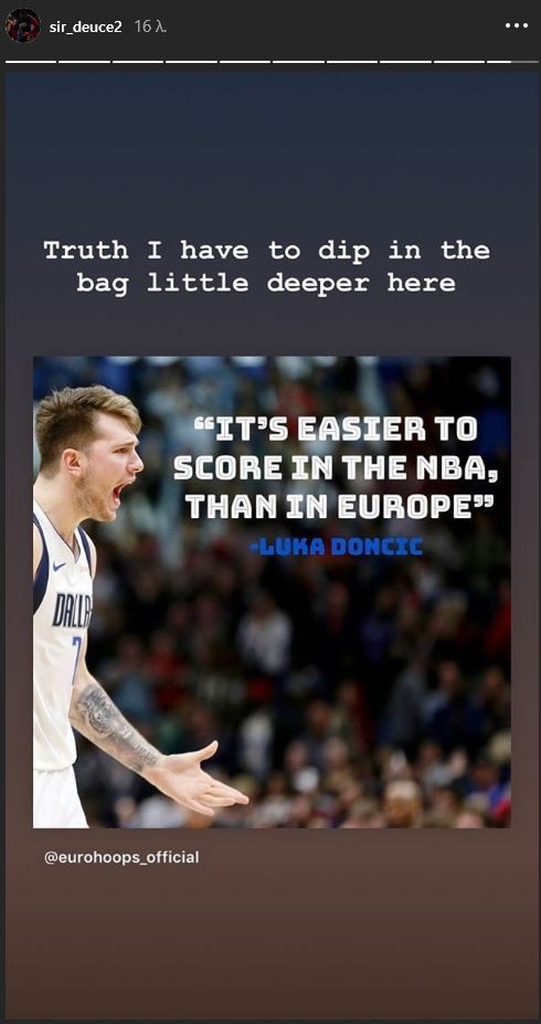 Συγκεκριμένα, ο Αμερικανός γκαρντ, ο οποίος έχει ήδη «μπει» στις προπονήσεις του Θρύλου, ανάρτησε μία φωτογραφία σε story στο Instagram, στην οποία απεικονίζεται ο Σλοβένος των Ντάλας Μάβερικς να λέει: «Είναι πιο εύκολο να σκοράρεις στο NBA, από ότι στην Ευρώπη».