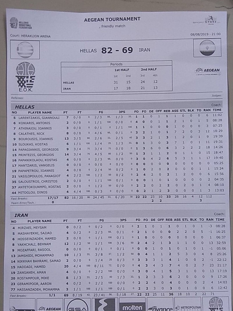 Με τον φόργουορντ του Ολυμπιακού να είναι ο πρώτος σκόρερ της Ελλάδας με 14 πόντους(4/5 δίποντα και 1/2 τρίποντο), 2 ριμπάουντ, 1 κλέψιμο, 1 ,μπλοκ σε 19 λεπτά. Ο Κώστας Παπανικολάου σε 19:40 λεπτά είχε 4 πόντους (2/3 δίποντα), 6 ριμπάουντ, 5 ασίστ, 3 κλεψίματα και 1 μπλοκ, ενώ σε 8:28 λεπτά ο Αντώνης Κόνιαρης είχε 2 πόντους (1/1 δίποντο), 2 ασίστ και 1 κλέψιμο.