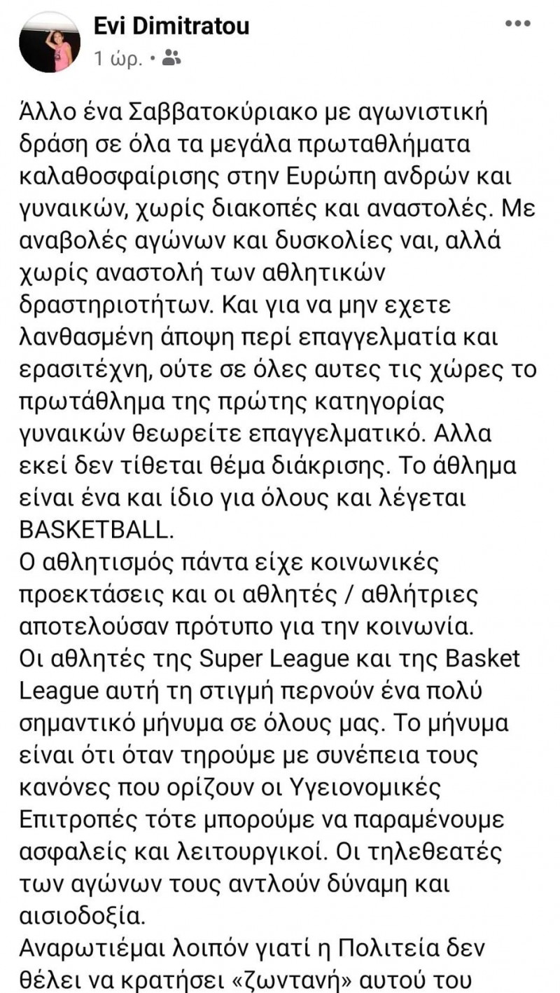 Οι αθλητές της Super League και της Basket League αυτή τη στιγμή περνούν ένα πολύ σημαντικό μήνυμα σε όλους μας. Το μήνυμα είναι ότι όταν τηρούμε με συνέπεια τους κανόνες που ορίζουν οι Υγειονομικές Επιτροπές τότε μπορούμε να παραμένουμε ασφαλείς και λειτουργικοί. Οι τηλεθεατές των αγώνων τους αντλούν δύναμη και αισιοδοξία.