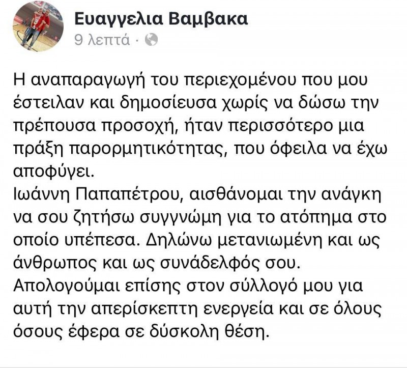 Απολογούμαι επίσης στον σύλλογό μου για αυτή την απερίσκεπτη ενεργεία και σε όλους όσους έφερα σε δύσκολη θέση», ανέφερε χαρακτηριστικά η αθλήτρια του Θρύλου.