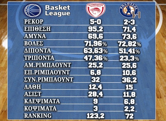 + Ο Ολυμπιακός έχει τα υψηλότερα ποσοστό ευστοχίας τόσο στα δίποντα (63,63%) όσο και στα τρίποντα (47,36%), μετά τις πέντε πρώτες αγωνιστικές στην Basket League. Στην κανονική περίοδο του περσινού Πρωταθλήματος είχε επίσης τα κορυφαία ποσοστά και στις δύο κατηγορίες εκτελώντας με 62,17% στα δίποντα και 39,83% στα τρίποντα.