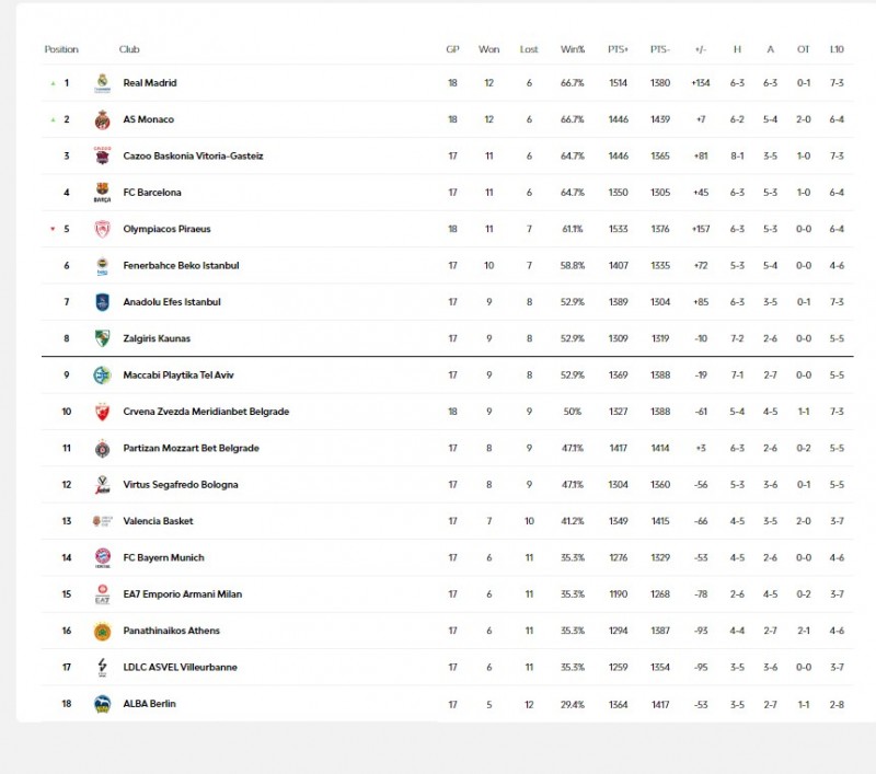 Ψηλά παραμένει ο Ολυμπιακός στη βαθμολογία της Ευρωλίγκας, παρά την ήττα με 64-60 από τη Μονακό. Ήταν η 7η ήττα σε 18 αναμετρήσεις.