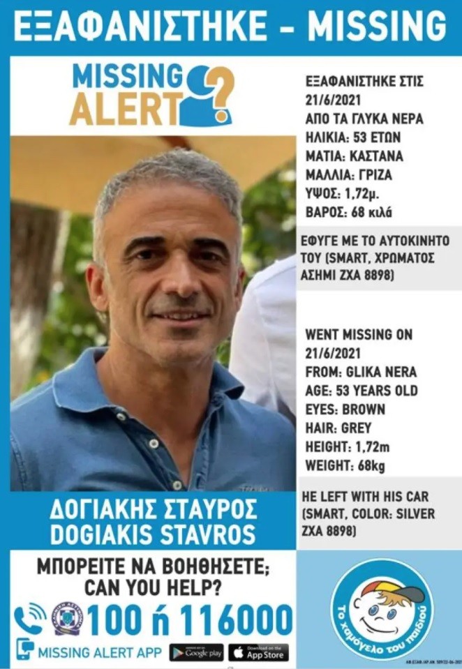 Όπως αναφέρει το Χαμόγελο του Παιδιού: «Στις 21 Ιουνίου 2021 εξαφανίστηκε από την περιοχή Γλυκά Νερά, ο Σταύρος Δογιάκης, 53 ετών. Το «Χαμόγελο του Παιδιού» ενημερώθηκε για την εξαφάνιση του Σταύρου Δογιάκη στις 22 Ιουνίου 2021 και προχώρησε στη δημοσιοποίηση των στοιχείων του ενήλικου κατόπιν αιτήματος του οικογενειακού του περιβάλλοντος, καθώς συντρέχουν λόγοι οι οποίοι θέτουν τη ζωή του σε κίνδυνο. Ο Σταύρος Δογιάκης έχει ύψος 1.72μ., είναι 68 κιλά, έχει γκρίζα μαλλιά και καστανά μάτια. Έφυγε με το όχημά του, μάρκας Smart χρώματος ασημί, με πινακίδα αριθμού κυκλοφορίας ΖΧΑ-8898».