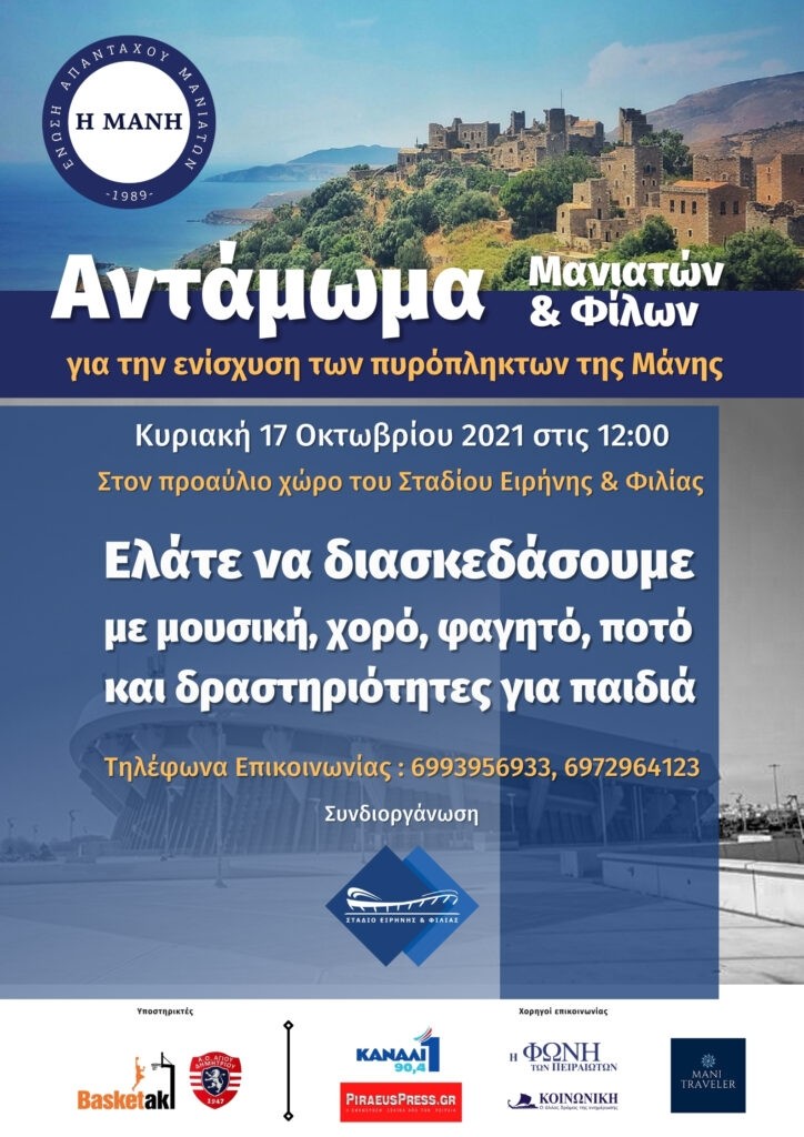 Την Κυριακή 17 Οκτωβρίου, στις 12.00 η Ένωση Απανταχού Μανιατών “Η Μάνη” και το Στάδιο Ειρήνης και Φιλίας διοργανώνουν το πρώτο Αντάμωμα Μανιατών και Φίλων. Η εκδήλωση θα έχει φιλανθρωπικό χαρακτήρα, καθώς όλα τα έσοδα θα διατεθούν για την ενίσχυση των πυρόπληκτων της Μάνης.