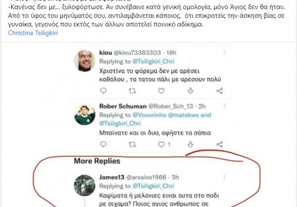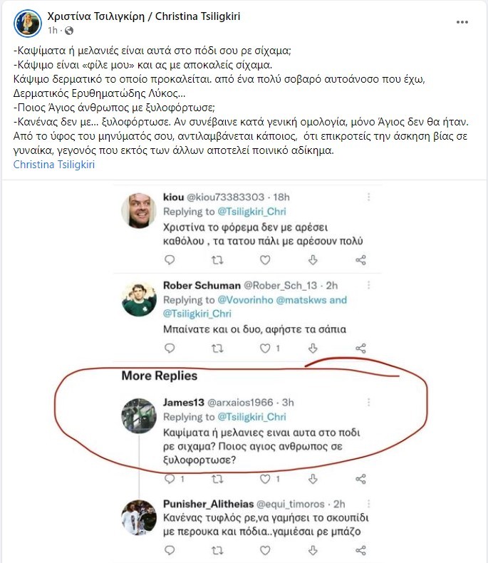 -Κανένας δεν με… ξυλοφόρτωσε. Αν συνέβαινε κατά γενική ομολογία, μόνο Άγιος δεν θα ήταν. Από το ύφος του μηνύματός σου, αντιλαμβάνεται κάποιος, ότι επικροτείς την άσκηση βίας σε γυναίκα, γεγονός που εκτός των άλλων αποτελεί ποινικό αδίκημα», έγραψε.