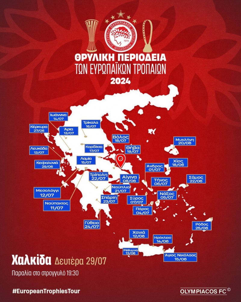 Οι ευρωκούπες του Ολυμπιακού συνεχίζουν την περιήγησή τους, ανά την Ελλάδα και, μετά την Πελοπόννησο, επιστρέφουν στη Στερεά Ελλάδα. Επόμενος σταθμός για τα δύο τρόπαια η Χαλκίδα, το απόγευμα της Δευτέρας (29/7, 19:30, Παραλία στο στρογγυλό).