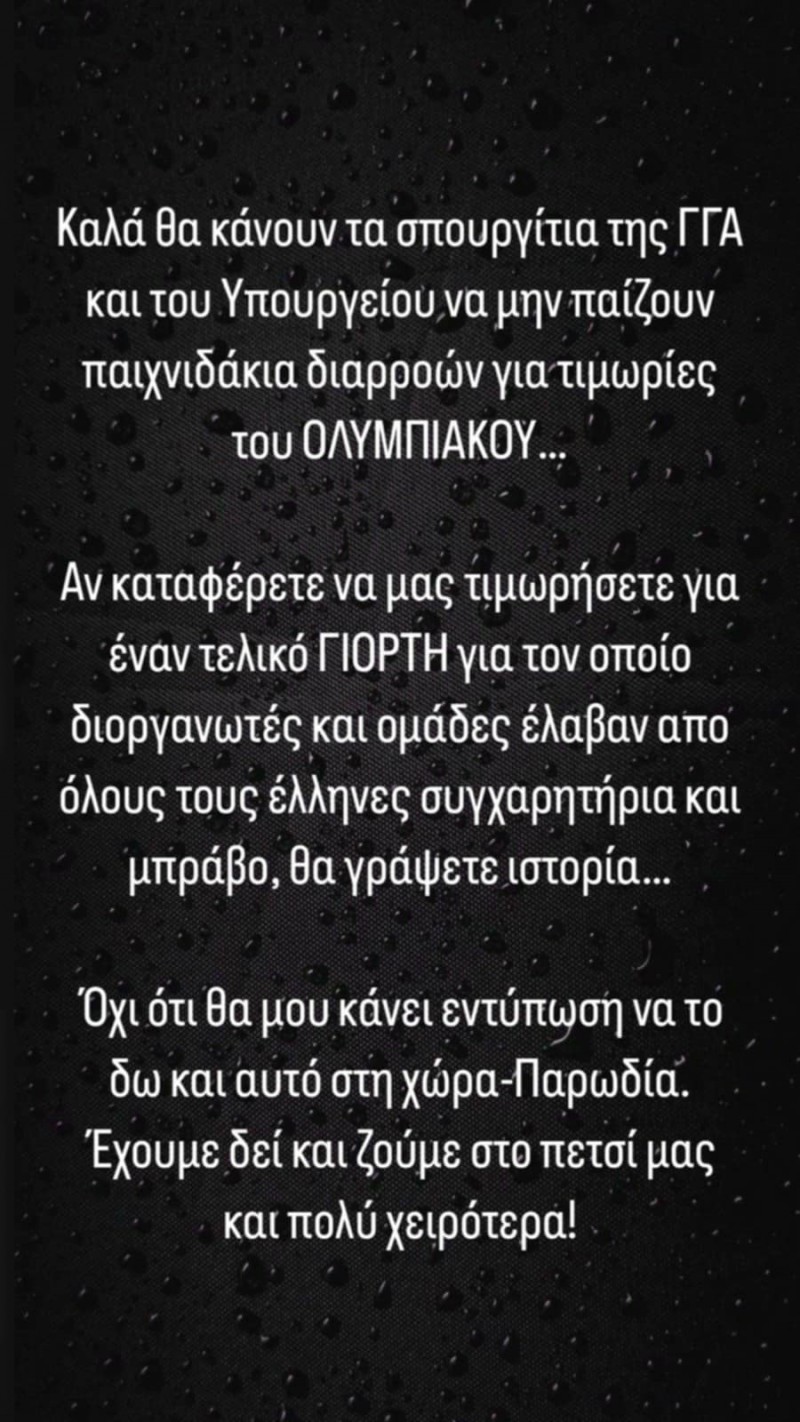 «Καλά θα κάνουν τα σπουργίτια της ΓΓΑ και του Υπουργείου να μην παίζουν παιχνιδάκια διαρροών για τιμωρίες του Ολυμπιακού. Αν καταφέρετε να μας τιμωρήσετε για έναν τελικό ΓΙΟΡΤΗ για τον οποίο διοργανωτές και ομάδες έλαβαν από όλους τους Έλληνες συγχαρητήρια και μπράβο, θα γράψετε ιστορία. Όχι ότι θα μου κάνει εντύπωση να το δω και αυτό στη χώρα-Παρωδία. Έχουμε δει και ζούμε στο πετσί μας και πολύ χειρότερα!