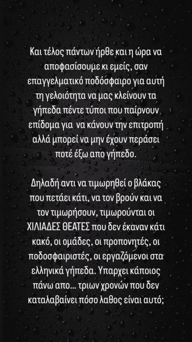 Δηλαδή αντί να τιμωρηθεί ο βλάκας που πετάει κάτι, να τον βρουν και να τον τιμωρήσουν, τιμωρούνται οι ΧΙΛΙΑΔΕΣ ΘΕΑΤΕΣ που δεν έκαναν κάτι κακό, οι ομάδες, οι προπονητές, οι ποδοσφαιριστές, οι εργαζόμενοι στα ελληνικά γήπεδα. Υπάρχει κάποιος πάνω από... τριών χρονών που δεν καταλαβαίνει πόσο λάθος είναι αυτό;».