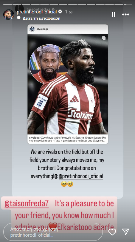 Η ιστορία του ποδοσφαιριστή του Θρύλου συγκίνησε και τον Τάισον Φρέντα του ΠΑΟΚ, ο οποίος έκανε ένα story στο instagram, γράφοντας: «Είμαστε αντίπαλοι στο γήπεδο, αλλά εκτός γηπέδου η ιστορία σου πάντα με συγκινεί αδερφέ μου! Συγχαρητήρια για όλα». Από την πλευρά του ο Ροντινέι, απάντησε: «Χαρά μου να είμαι φίλος σου, ξέρεις πόσο σε θαυμάζω. Ευχαριστώ αδερφέ».