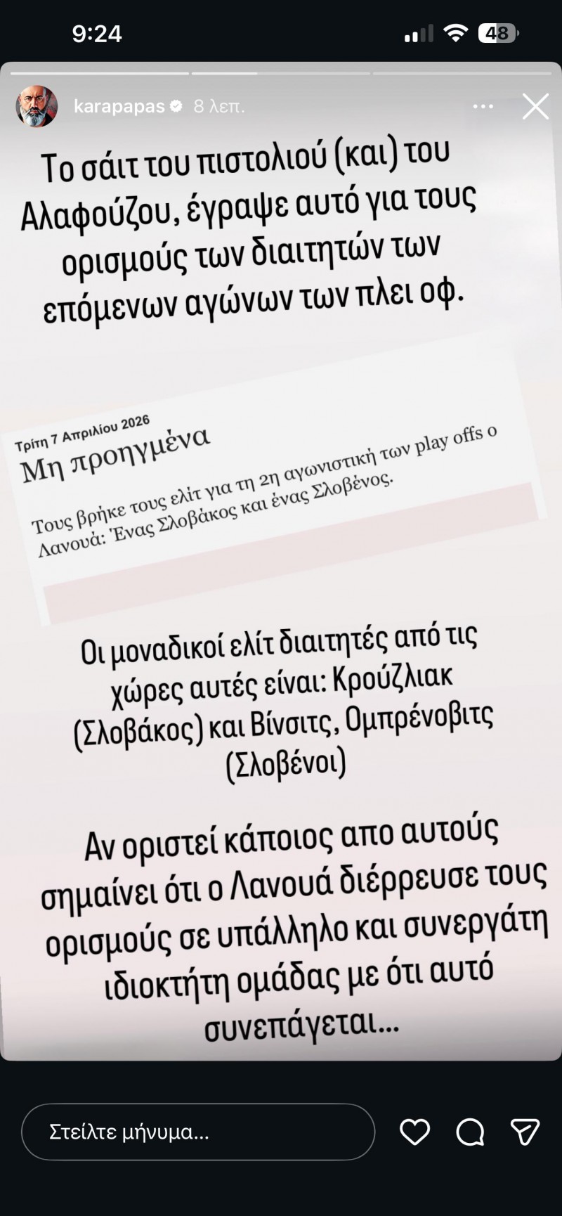 «Το σάιτ του πιστολιού (και) του Αλαφούζου, έγραψε αυτό για τους ορισμούς των διαιτητών των επόμενων αγώνων των πλέι οφ. Οι μοναδικοί ελίτ διαιτητές από τις χώρες αυτές είναι: Κρούζλιακ (Σλοβάκος) και Βίνσιτς, Ομπρέοβιτς (Σλοβένοι). Αν οριστεί κάποιος από αυτούς σημαίνει ότι ο Λανουά διέρρευσε τους ορισμούς σε υπάλληλο και συνεργάτη ιδιοκτήτη ομάδας με ότι αυτό συνεπάγεται...»