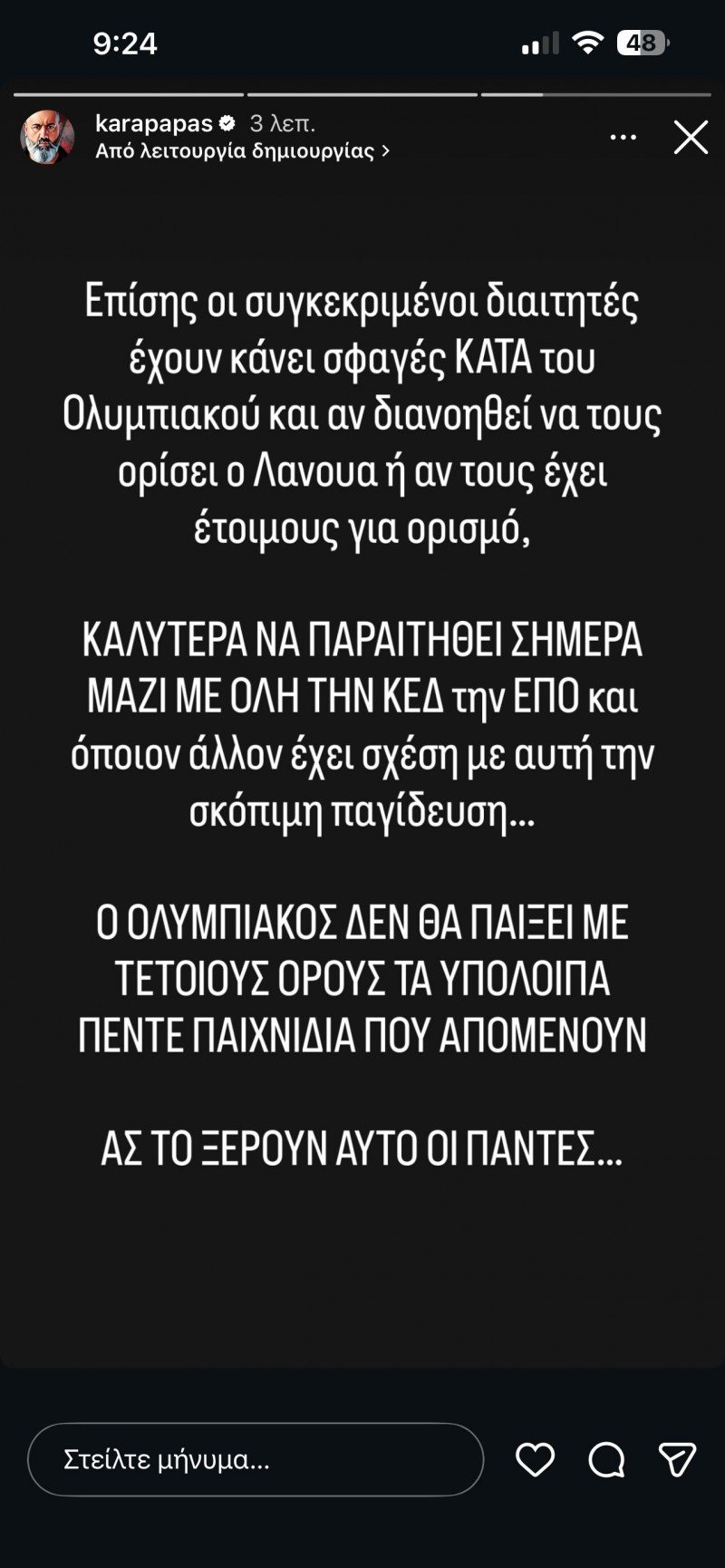 «Επίσης οι συγκεκριμένοι διαιτητές έχουν κάνει σφαγές ΚΑΤΑ του Ολυμπιακού και αν διανοηθεί να τους ορίσει ή αν τους έχει έτοιμους για ορισμό, ΚΑΛΥΤΕΡΑ ΝΑ ΠΑΡΑΙΤΗΘΕΙ ΣΗΜΕΡΑ ΜΑΖΙ ΜΕ ΟΛΗ ΤΗΝ ΚΕΔ την ΕΠΟ και όποιον άλλον έχει σχέση με αυτή την σκόπιμη παγίδευση... Ο ΟΛΥΜΠΙΑΚΟΣ ΔΕΝ ΘΑ ΠΑΙΞΕΙ ΜΕ ΤΕΤΟΙΟΥΣ ΟΡΟΥΣ ΤΑ ΥΠΟΛΟΙΠΑ ΠΕΝΤΕ ΠΑΙΧΝΙΔΙΑ ΠΟΥ ΑΠΟΜΕΝΟΥΝ