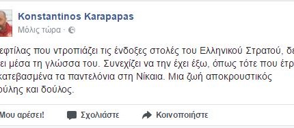 «Ο ξεφτίλας που ντροπιάζει τις ένδοξες στολές του Ελληνικού Στρατού, δε βάζει μέσα τη γλώσσα του. Συνεχίζει να την έχει έξω, όπως τότε που έτρεχε με κατεβασμένα τα παντελόνια στη Νίκαια. Μια ζωή αποκρουστικός μπούλης και δούλος».
