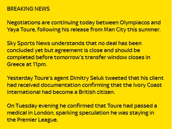 Θέμα χρόνου θεωρεί και το Sky Sports τη μεταγραφή του Γιάγια Τουρέ στον Ολυμπιακό! Μάλιστα, φιλοξενεί μία αναφορά στις σχετικές εξελίξεις, όπως μπορείτε να δείτε και παρακάτω.