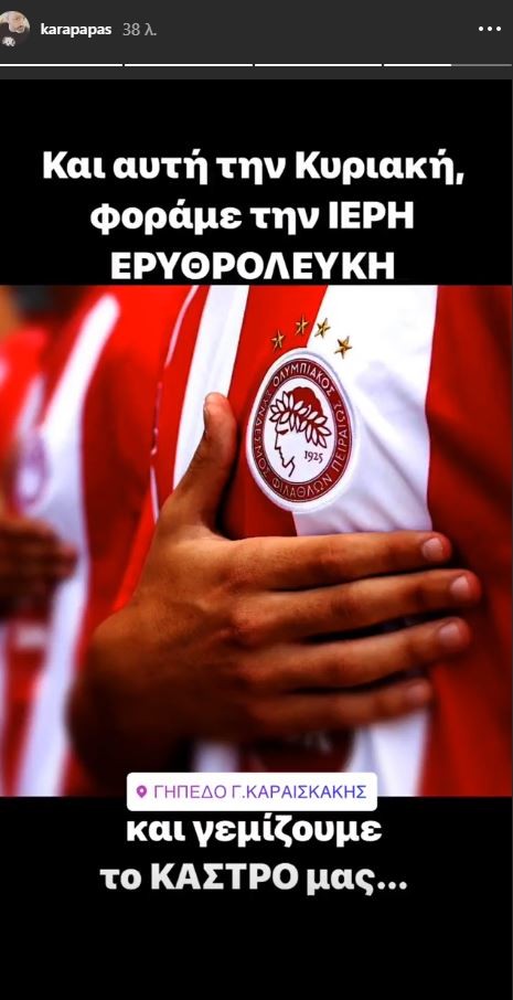 Συγκεκριμένα, ο Διευθυντής Επικοινωνίας της «ερυθρόλευκης» ΠΑΕ ανάρτησε μία φωτογραφία στο Insta story του, στην οποία απεικονίζεται η φανέλα του Θρύλου και αναγράφεται: «Και αυτή την Κυριακή, φοράμε την ιερή ερυθρόλευκη και γεμίζουμε το Κάστρο μας».