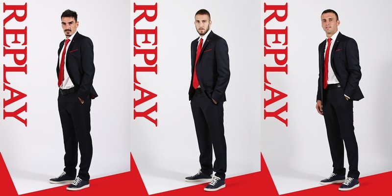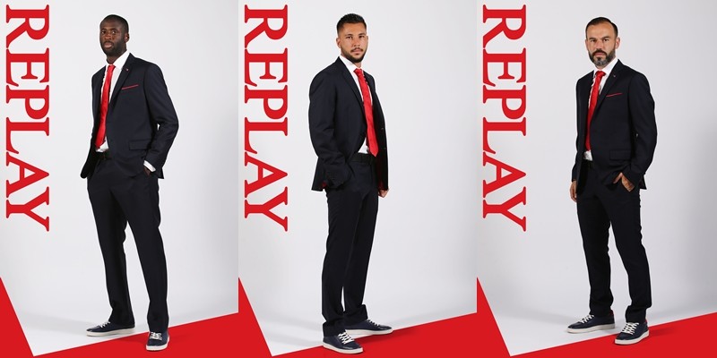 Αποκλειστικά ραμμένη στην Ιταλία, η επίσημη ενδυμασία περιλαμβάνει κοστούμι, πουκάμισο, γραβάτα, ζώνη και παπούτσια, με τη μοναδική ταυτότητα και το ξεχωριστό design REPLAY. Τα Blue navy κοστούμια με κόκκινη φόδρα και κόκκινο μαντίλι δίνουν έναν επίσημο τόνο στην εμφάνιση της ομάδας. Συνοδευτικές λεπτομέρειες με έντονο χαρακτήρα είναι η κόκκινη γραβάτα και το χαρακτηριστικό μονόγραμμα R στο πέτο, ενώ τα υψηλής ποιότητας δερμάτινα παπούτσια ολοκληρώνουν το σύνολο με την κόκκινη υπογραφή Replay στο πίσω μέρος.