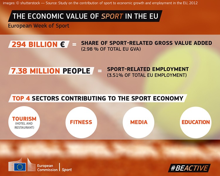 Ο αθλητισμός άλλωστε αποτελεί ένα πολύ σημαντικό κομμάτι της καθημερινότητας των Ευρωπαίων σε προσωπικό, κοινωνικό αλλά και οικονομικό επίπεδο. Σύμφωνα με την Ευρωπαϊκή Επιτροπή, περίπου 7,4 εκατ. συμπολίτες μας απασχολούνται σε εργασίες οι οποίες έχουν άμεση σχέση με τον Αθλητισμό, ενώ το σύνολο του οικονομικού αποτελέσματος σε επίπεδο Ευρωπαϊκού ΑΕΠ από τον Αθλητισμό, ανέρχεται σε 294 Δις Ευρώ, με τους τομείς του Τουρισμού, του Fitness, των Media και της Εκπαίδευσης να λαμβάνουν σημαντικά οικονομικά οφέλη από την Αθλητική Δραστηριότητα.