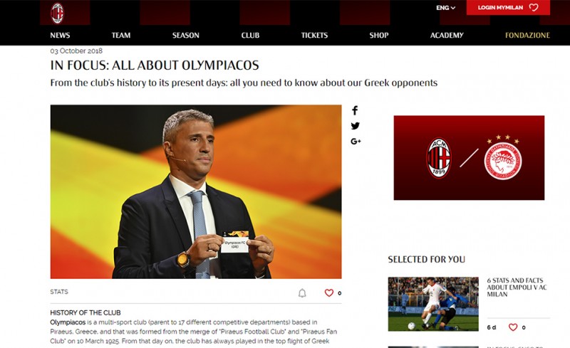 Στην παρουσίαση του αυριανού της αντιπάλου, του Ολυμπιακού, προχώρησε η Μίλαν, μέσα από την επίσημη ιστοσελίδα της. «Ο Ολυμπιακός είναι ένα πολυαθλητικό κλαμπ (έχει 17 διαφορετικά τμήματα), με βάση του τον Πειραιά και ιδρύθηκε στις 10 Μαρτίου 1925. Από εκείνη τη μέρα, ο σύλλογος βρίσκεται στα ψηλά στρώματα του ελληνικού ποδοσφαίρου, όντας μία από τις τρεις ομάδες που δεν έχουν υποβιβαστεί ποτέ.