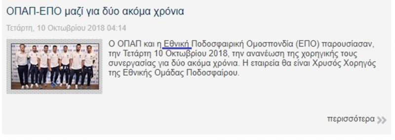 Πάντως, στην ίδια την ΕΠΟ μάλλον «επιλέγουν» τη δεύτερη απάντηση, μιας και σε είδηση πέντε ημερών αναγράφουν (ακόμα) «η Εθνική Ποδοσφαιρική Ομοσπονδία (ΕΠΟ)». Όπως μπορείτε να δείτε και στην παρακάτω φωτογραφία! Προφανώς θα μπερδεύτηκαν με την Εθνική ομάδα ποδοσφαίρου, δεν εξηγείται αλλιώς.
