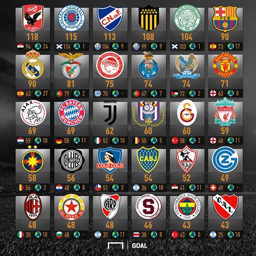 Μπροστά από τον Ολυμπιακό βρίσκονται μόνο η Αλ Αχλί (Αίγυπτος) με 118, η Ρέιντζερς (Σκωτία) με 115, η Μοντεβιδέο Νασιονάλ (Ουρουγουάη) με 113, η Πενιαρόλ (Ουρουγουάη) με 108, η Σέλτικ (Σωκτία) με 105, η Ρεάλ Μαδρίτης και η Μπαρτσελόνα με 90 και η Μπενφίκα (Πορτογαλία) με 81.