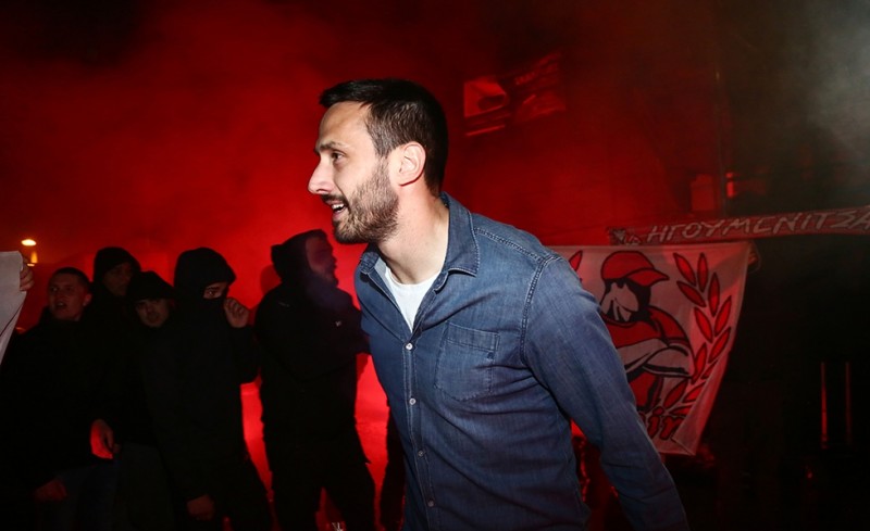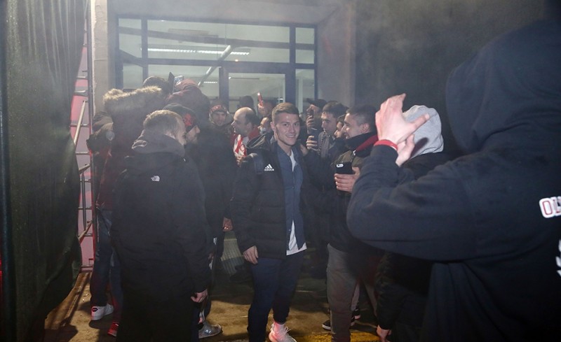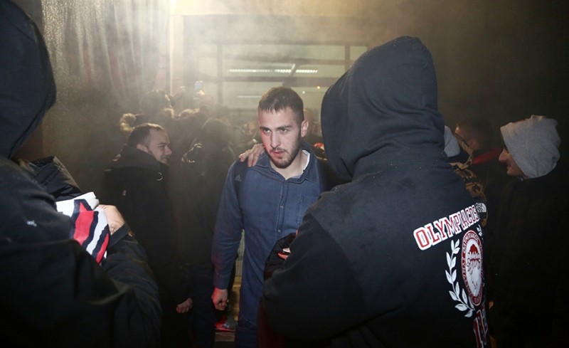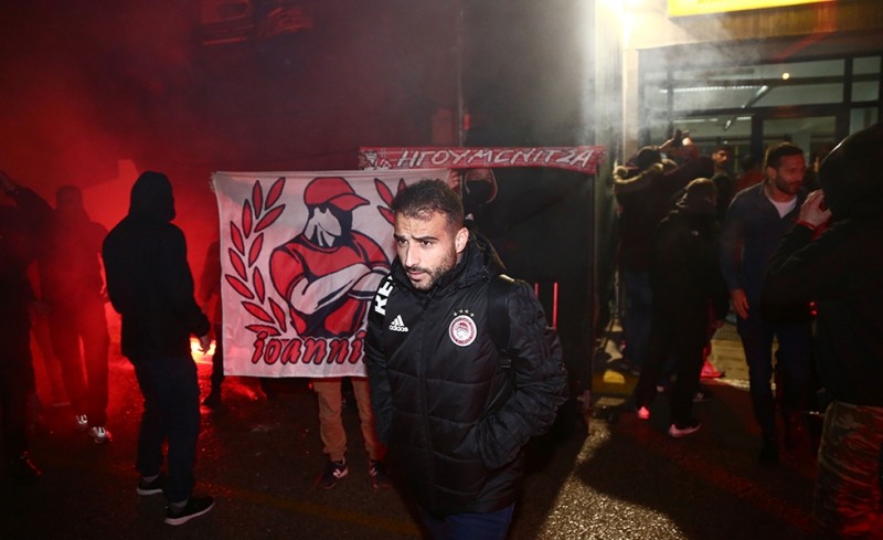 Οι οπαδοί του Ολυμπιακού περίμεναν πως και πως να δουν από κοντά τους παίκτες της αγαπημένης τους ομάδας και να τους αποθεώσουν, με συνθήματα, καπνογόνα και πανό!
