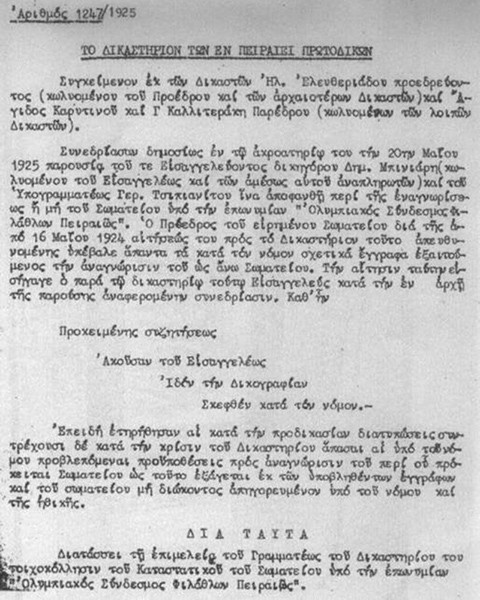 Αυτό περιέχει και το ιδρυτικό και ιστορικό καταστατικό του Ολυμπιακού Συνδέσμου Φιλάθλων Πειραιώς. Στο πρώτο του άρθρο αναφέρει ότι «Συνιστᾶται ἐν Πειραιεῖὑπό τόν τίτλον «Ὀλυμπιακός Σύνδεσμος Φιλάθλων Πειραιῶς» Σωματεῖον, οὕτινος σκοπός εἶναι η ἀνάπτυξις τῆς σωματικῆς ἀγωγῆς παρά τῇ νεολαίᾳ καί ἡ κατά πάντα φίλαθλον τρόπον ἐξύψωσις αυτῆς. Τά πρός ἐπίτευξην τοῦ σκοποῦ τούτου μέσα ἔσονται α) ἡἵδρυσις ἀθλητικῶν χώρων πάσης φύσεως, β) ἡὀργάνωσις πάσης κατά θάλασσαν ἀθλητικῆς κινήσεως, γ) ἡὀργάνωσις ἀθλητικῶν ἀγώνων πάσης φύσεως, ἑορτῶν, ἐκδρομῶν, ὀρειβασιῶν κλπ., δ) ἡ διά διαλέξεων καί ἐκδόσεως ἐντύπων προπαγάνδισις τῆς ἀθλητικῆς ἰδέας καί ε) ἡ διά παντός τρόπου ἀνάπτυξις κινήσεως ἐξυπηρετικῆς τῆς νεολαίας. Ο «Ὀλυμπιακός Σύνδεσμος Φιλάθλων Πειραιῶς» ἔχει ἰδία σφραγῖδα εἰκονίζουσαν δαφνηφόρον κεφαλήν ἀθλητοῦ και περί αὐτήν τόν τίτλον τοῦ Σωματείου».