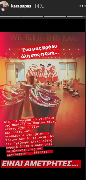 Στην πρώτη, έγραψε: «Να μας ζήσει». Στη δεύτερη, σχολίασε: «Ένα μας βράδυ όλη σας η ζωή. Είπα με αφορμή τα γενέθλια της Μαρίνας να θυμίσω πόσες κούπες έχει η ίδια και πόσες κάτι νεόπλουτοι Συριζαίοι… Τελικά δεν θα το κάνω. Θα τις βγάζουμε λίγες λίγες καμμιά βόλτα ή όλες μαζί να βλέπετε μπας και καταλάβετε… Βλέπετε… ΕΙΝΑΙ ΑΜΕΤΡΗΤΕΣ…».