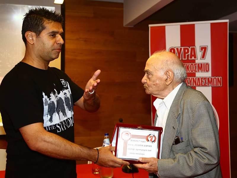 Ήταν από τις στιγμές που ξεχώρισαν στο 12ο Παγκόσμιο Συνέδριο της Θύρας 7. Ο Πρόεδρος του Συνδέσμου Βετεράνων Ποδοσφαιριστών του Ολυμπιακού, Γιώργος Δαρίβας, βραβεύτηκε για την τεράστια προσφορά του στο σύλλογο και απευθυνόμενος προς τον Βαγγέλη Μαρινάκη, του είπε:
