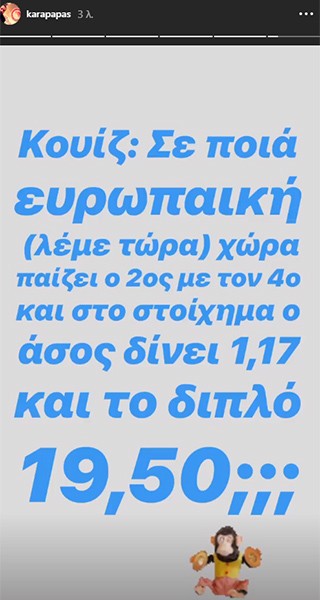 «Κουίζ: Σε ποια ευρωπαϊκή (λέμε τώρα) χώρα παίζει ο 2ος με τον 4ο και στο στοίχημα ο άσος δίνει 1,17 και το διπλό 19,50;;;», διερωτάται ο Κώστας Καραπαπάς.