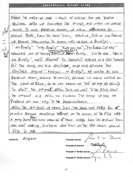 Οι διαιτητές επιβεβαιώνουν την έκθεση του παρατηρητή, όπως αναφέρει η ιστοσελίδα dikografies.blogspot.com. Αναλυτικά όσα αναφέρει ο διαιτητής στο φύλλο αγώνα: «Με την ολοκλήρωση του πρώτου ημιχρόνου και καθώς πηγαίναμε στα αποδυτήρια, μας πλησίασαν αρκετοί άνθρωποι από τη γηπεδούχο ομάδα, φωνάζοντας, σπρώχνοντας και τραβώντας μας γιατί ήθελαν να μάθουν το λόγο που δώσαμε πέναλτι.