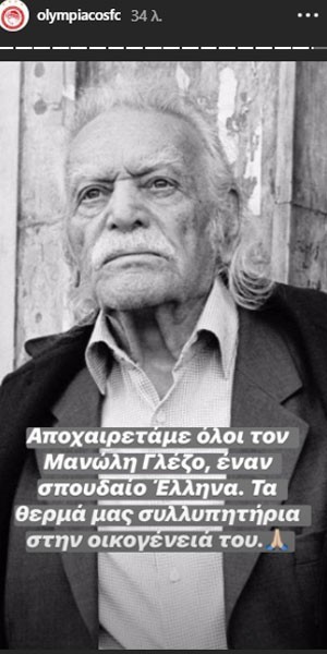 «Αποχαιρετάμε όλοι τον Μανώλη Γλέζο, έναν σπουδαίο Έλληνα. Τα θερμά μας συλλυπητήρια στην οικογένειά του».