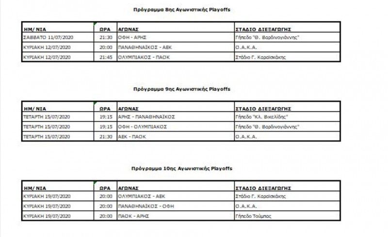 Το πλήρες πρόγραμμα των 3 τελευταίων αγωνιστικών των πλέι οφ ανακοίνωσε η Super League. Έτσι, ο Ολυμπιακός παίζει με τον ΠΑΟΚ την προσεχή Κυριακή, φιλοξενείται από τον ΟΦΗ την επόμενη Τετάρτη και κλείνει τη σεζόν με την ΑΕΚ την Κυριακή 19/7.