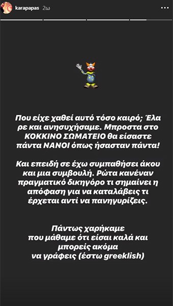 Πάντως χαρήκαμε που μάθαμε ότι είσαι καλά και μπορείς ακόμα να γράφεις (έστω και greeklish)», σχολίασε ο Αντιπρόεδρος της ΠΑΕ Ολυμπιακός, Κώστας Καραπαπάς.