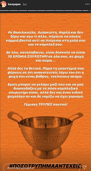 Την απάντησή του στους... γνωστούς έδωσε ο Κώστας Καραπαπάς. Δείτε τι έγραψε ο Αντιπρόεδρος της ΠΑΕ Ολυμπιακός: «Ρε Βασιλικούλα, Αυλακιώτη, Καρλή και δεν ξέρω και εγώ τι άλλο, πήγαινε να κάνεις καμία βουτιά αντί να πνίγεσαι στη χολή σου και το κόμπλεξ σου.