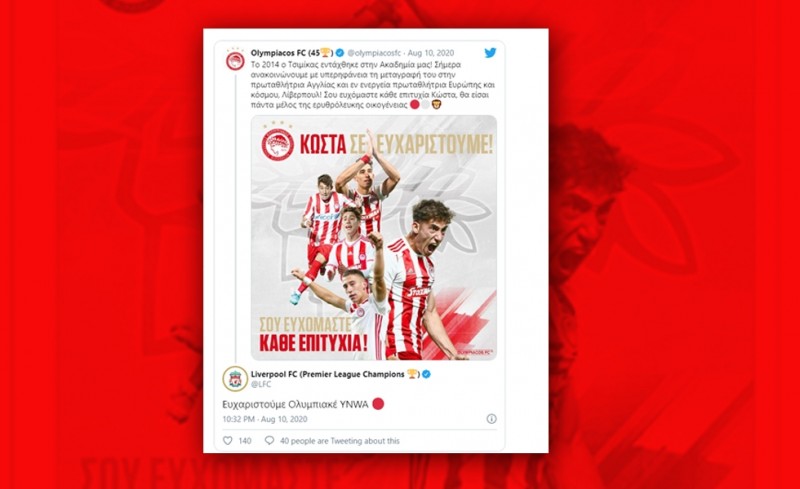 Πιο συγκεκριμένα στο αποχαιρετιστήριο μήνυμα του Ολυμπιακού στον 24χρονο αριστερό μπακ, η αγγλική ομάδα απάντησε γράφοντας: "Ευχαριστούμε Ολυμπιακέ, You Will Never Walk Alone" .