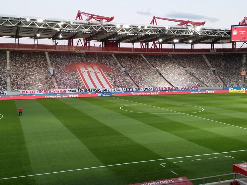 Δύο πανό βρίσκονται στις κεντρικές εξέδρες του «Γεώργιος Καραϊσκάκης» πριν την έναρξη του αγώνα του Ολυμπιακού με τον ΠΑΟΚ.