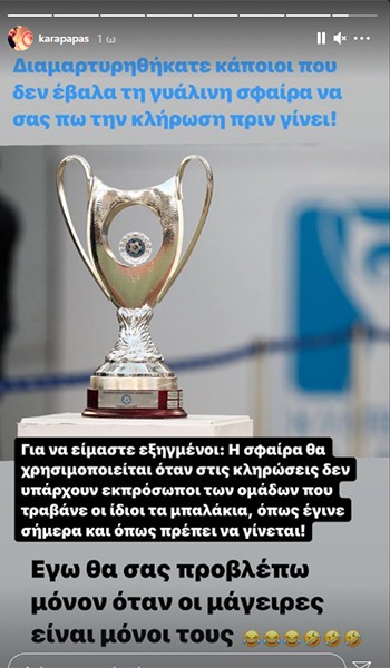 Το μήνυμά του για την κλήρωση του Κυπέλλου Ελλάδας με ένα επικό σχόλιο-γλέντι, έκανε ο Κώστας Καραπαπάς, γράφοντας για γυάλινες σφαίρες και μάγειρες!
