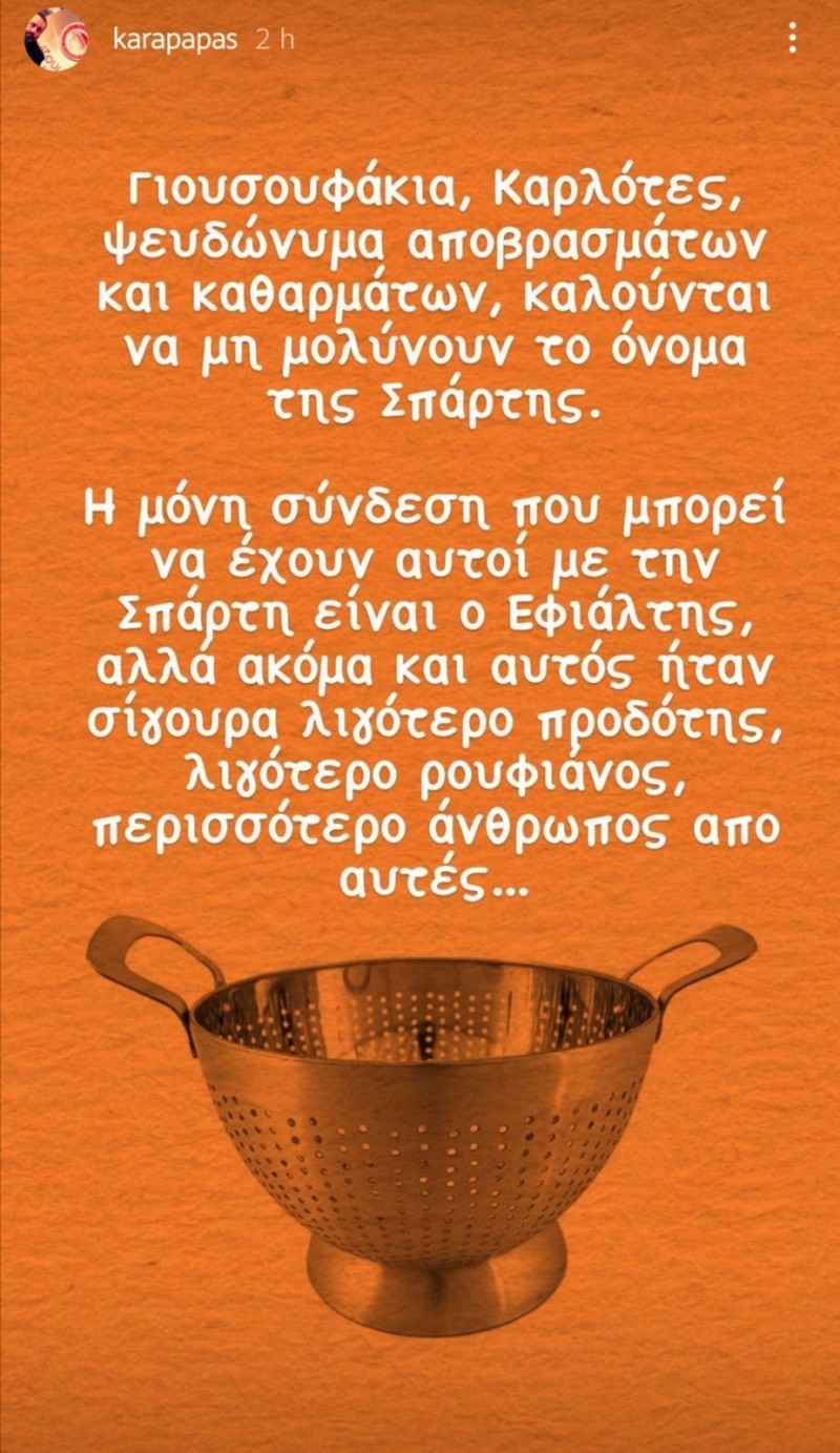 Ο Αντιπρόεδρος του Ολυμπιακού, με γλώσσα που «τσακίζει κόκκαλα» ως συνήθως! Γλεντάει «Εφιάλτες και γιουσουφάκια» ο Καραπαπάς! Σήμερα καταπιάστηκαν με… ασπίδες και Σπάρτες και… ή ταν ή επι τας. Και ο Κώστας Καραπαπάς είχε την απάντηση, όπως κάνει πάντα, άλλωστε, προς εκείνους, που πιάνουν στο στόμα τους τον Ολυμπιακό, θέλοντας να τον πλήξουν. Θέλοντας, δίχως να μπορούν, βέβαια, εδώ που τα λέμε… Αφού παραμένουν «νάνοι», μπροστά στον Θρύλο, όπως έλεγε κάποτε και ο Σταύρος Νταϊφάς, για τους αντιπάλους του Ολυμπιακού.
