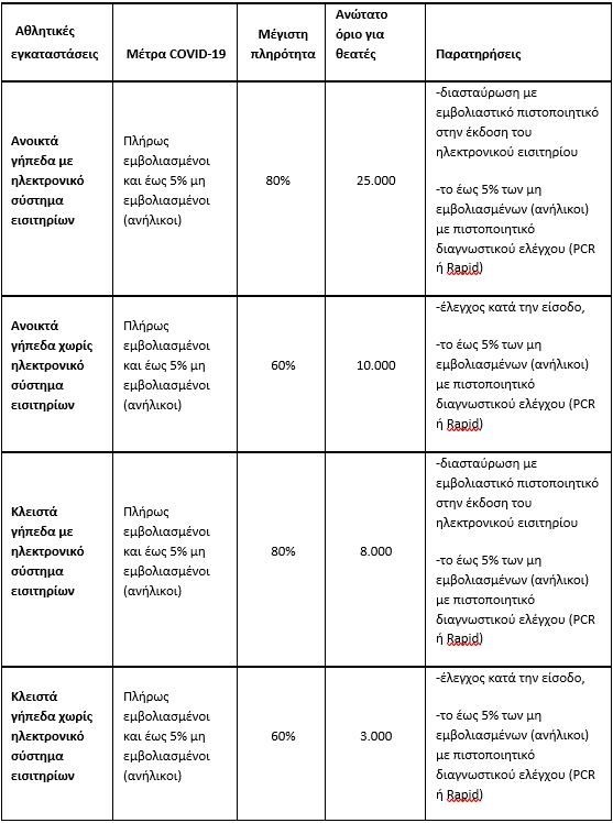 Μόνο εμβολιασμένοι θα μπορούν να μπουν στα γήπεδα και η πληρότητα των γηπέδων θα μπορεί να φτάνει μέχρι το 80%. Από εκεί και πέρα υπάρχει εξαίρεση για τους ανήλικους που δεν μπορούν να εμβολιαστούν και θα υπάρχει ένα ποσοστό 5% που θα μπορεί να μπει στο γήπεδο, υπό προϋποθέσεις.