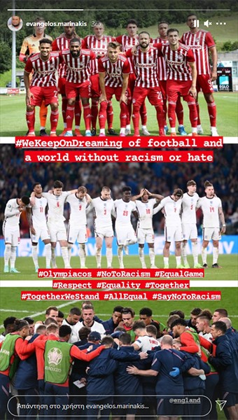 Το μήνυμά του κατά του ρατσισμού έστειλε ο Πρόεδρος του Ολυμπιακού, Βαγγέλης Μαρινάκης, στηρίζοντας τους παίκτες της Εθνικής Αγγλίας για τις ρατσιστικές επιθέσεις που δέχτηκαν μετά τα χαμένα πέναλτι στον τελικό του Euro 2020.