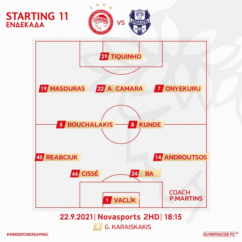 Ο Ολυμπιακός αντιμετωπίζει τον Απόλλωνα Σμύρνης και ο Πέδρο Μαρτίνς ρίχνει στη μάχη τους ποδοσφαιριστές του, με στόχο το τρίποντο και τη θετική συνέχεια, στο κυνήγι του 47ου! Ο Ολυμπιακός έχει δεδομένες απουσίες, σημαντικές, οι οποίες τον αναγκάζουν να κάνει εκ νέου διαφοροποιήσεις, στον τρόπο με τον οποίο παίζει.