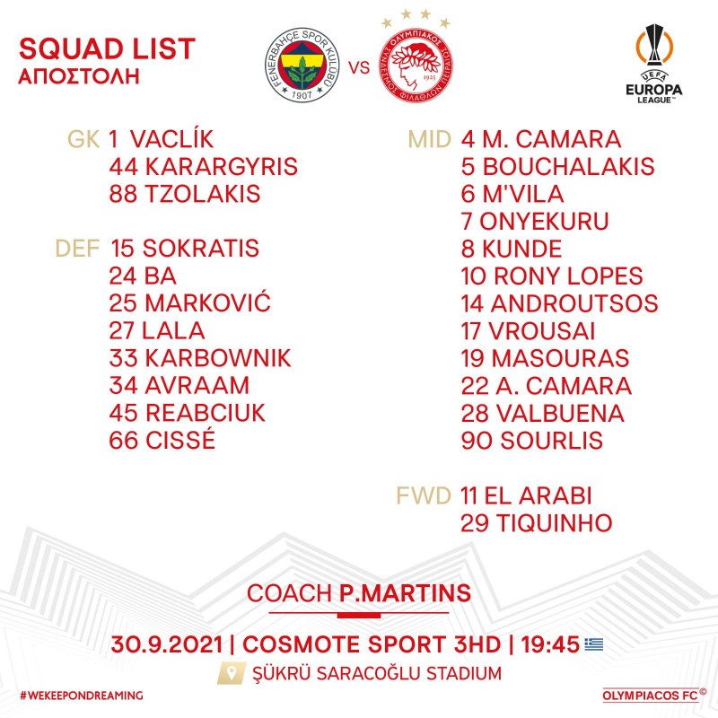 Αναλυτικά η αποστολή για τον αγώνα της Πέμπτης (30/09) με την Φενερμπαχτσέ στην Τουρκία: