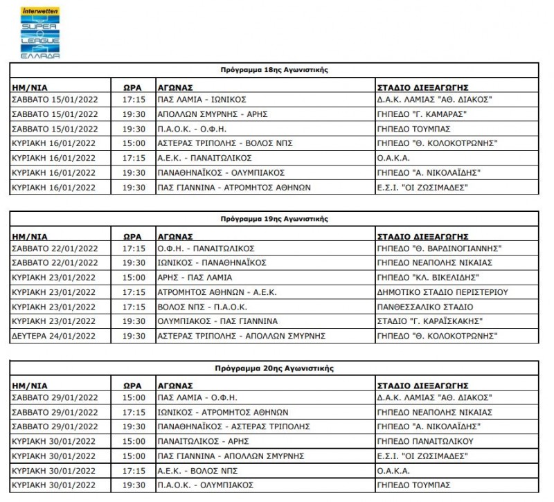 Ανακοινώθηκε από τη Σούπερ Λιγκ, το μεσημέρι της Δευτέρας, το αναλυτικό πρόγραμμα του πρωταθλήματος, για τον 2ο γύρο! Ξεχωρίζουν, φυσικά, τα ντέρμπι με Παναθηναϊκό, ΑΕΚ και ΠΑΟΚ, τα οποία συγκεντρώνουν ως συνήθως το μεγαλύτερο ενδιαφέρον: