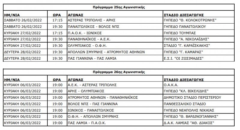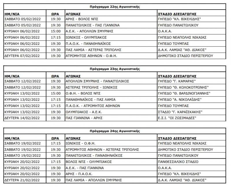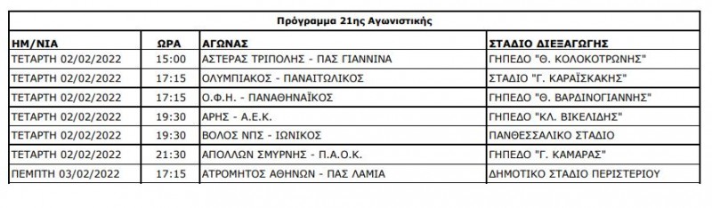 23η αγωνιστική: Ολυμπιακός-ΑΕΚ την Κυριακή 13/2/2021 στις 19:30.